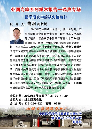 为促进学术交流,提升科研水平,中国医学科学院基础医学研究所(以下简称“基础所”)于2022年6月15日--6月16日举办外国专家系列学术报告活动。基础所许群教授邀请美国密西根州立大学陈红磊教授、美国圣地亚哥州立大学杨明安副教授、瑞典厄勒布鲁大学曹阳副教授带来三场精彩的学术报告。基础所流行病与卫生统计学系主任单广良教授主持此次学术交流会议。三位外国专家分别就“Olfaction, Neurodegenerative Diseases, and Beyond(嗅觉,神经退行性疾病,及其延伸)”、“Bayesian Variable Selection for Nonparametric Mixed Effects Models(非参数混合效应模型中的贝叶斯变量选择方法)”、“Imputation for Missing Data in Medical Research(医学研究中的缺失值填补)”三个主题展开此次学术交流活动。